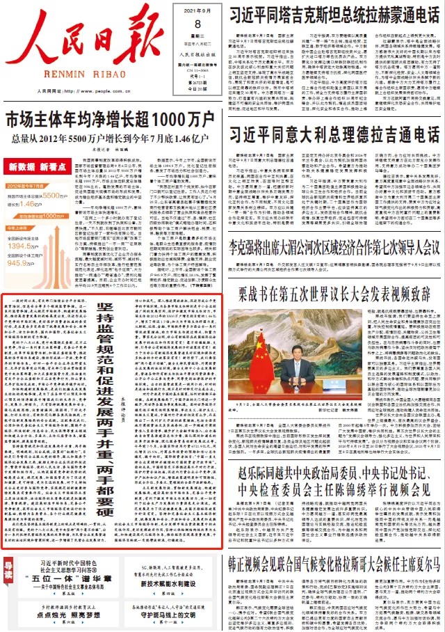 《人民日报》9月8日头版推出评论员文章《坚持监管规范和促进发展两手并重、两手都要硬》指出,我们党在坚持基本经济制度上的观点是明确的、一贯的,从来没有动摇。事实充分证明,非公有制经济在我国经济社会发展中的地位和作用没有变!毫不动摇鼓励、支持、引导非公有制经济发展的方针政策没有变!致力于为非公有制经济发展营造良好环境和提供更多机会的方针政策没有变!