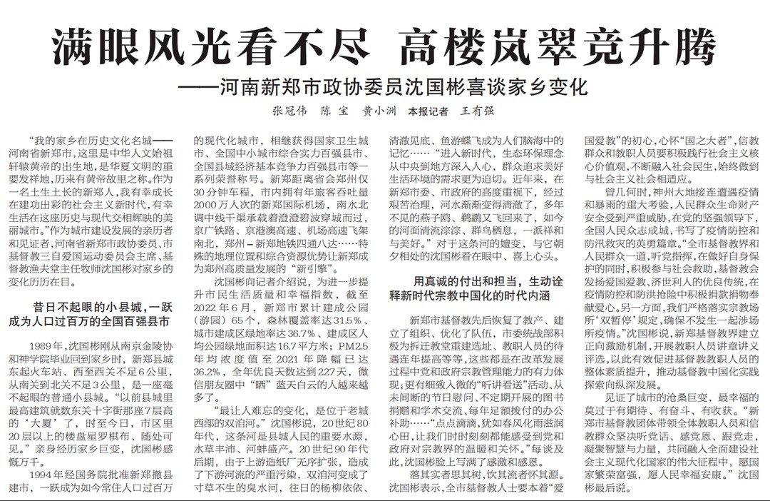 今天,《人民政协报》第8版以《满眼风光看不尽 高楼岚翠竞升腾——河南新郑市政协委员沈国彬喜谈家乡变化》为题,通过一名政协委员谈家乡变化的方式生动诠释新时代宗教中国化的时代内涵。一起来看报道。