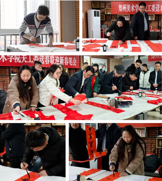 郑州美术学院侨胞之家联合学院关工委在中牟县广惠街办事处听篌街社区居民委员会活动室举行“送春联迎新春”笔会活动,郑州美术学院相关负责同志,中牟广惠街侨胞眷属代表等参加活动。