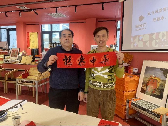 活动现场,侨务工作志愿者早早摆好桌椅,备好笔墨纸砚,郑州美术学院领导和教师倾情挥墨,书写下一副副恭贺龙年新春的对联和一张张祈盼美好生活的福字。不少侨界群众主动邀请老师“定制”春联内容,老师们也一一给予回应,以书法送上新春祝福。